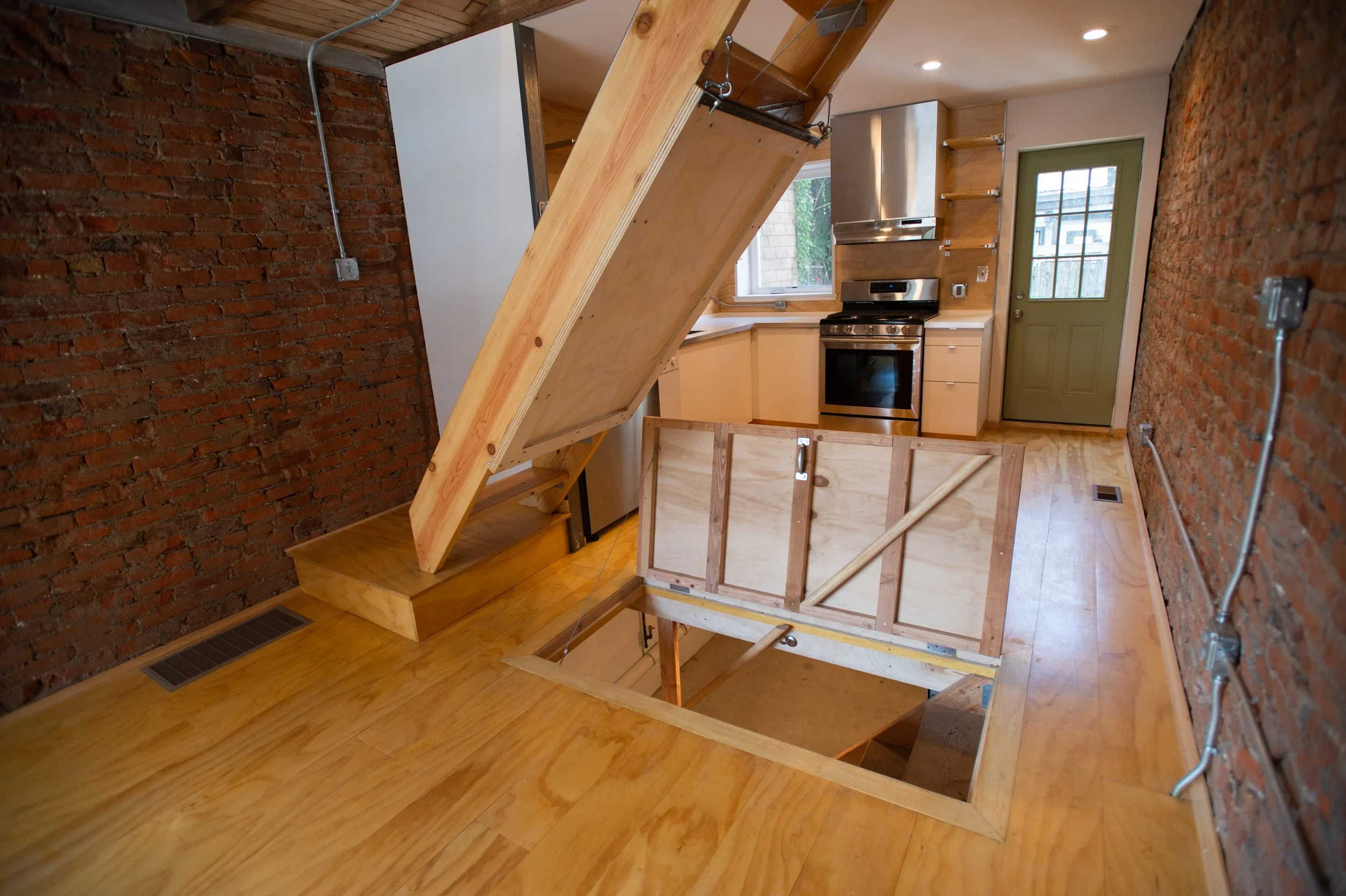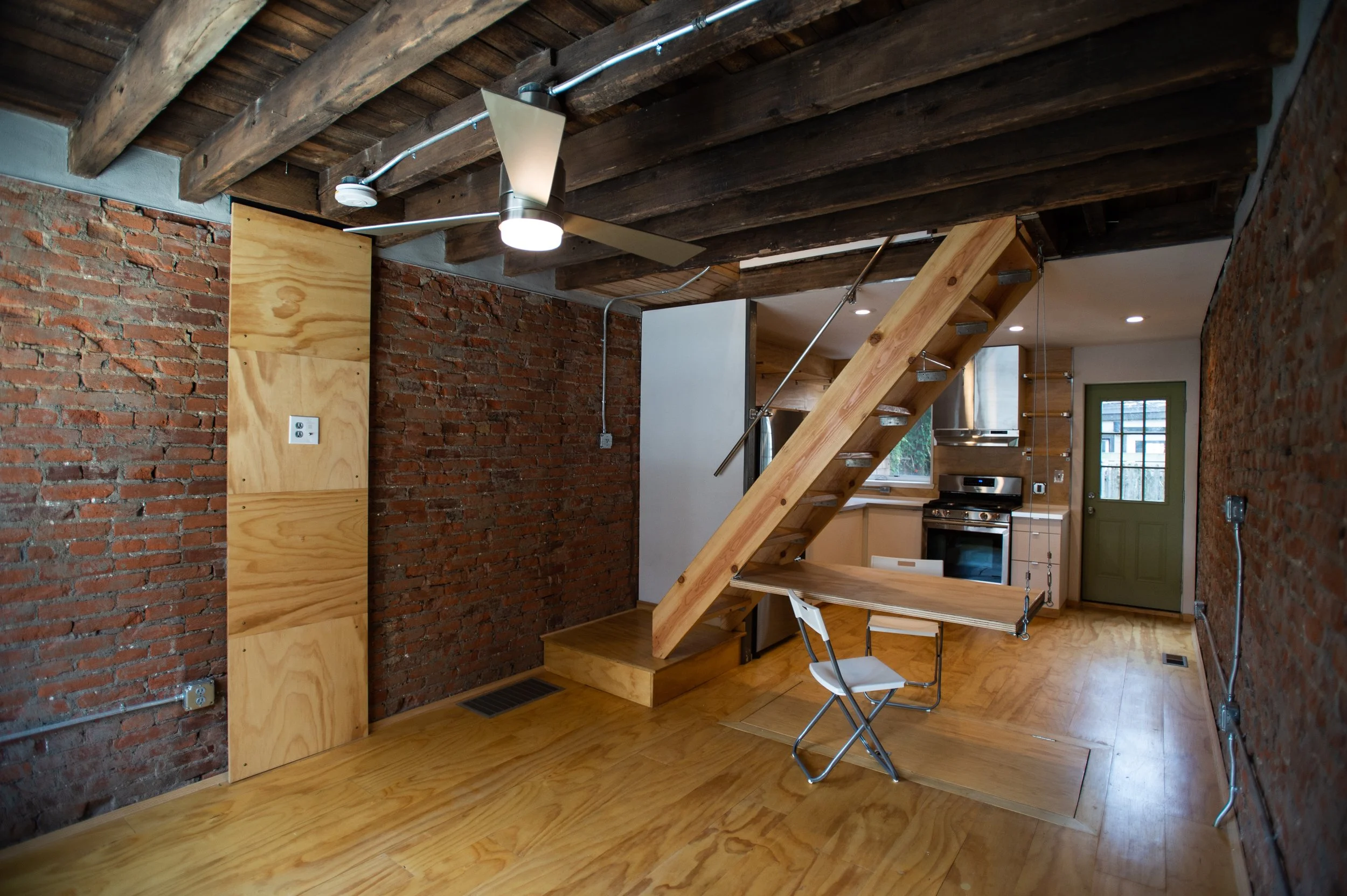 This row home was under 600sqft and quite a challenge to make work. With multiple calls to city inspectors about code compliance, the responses were always the same: “It’s fine, none of these old Philly houses meet square footage code compliance. Do the best you can.” Some space saving features include a drop down table under the stairs, basement access trap door and barn doors for the bedrooms to eliminate door swing footage.